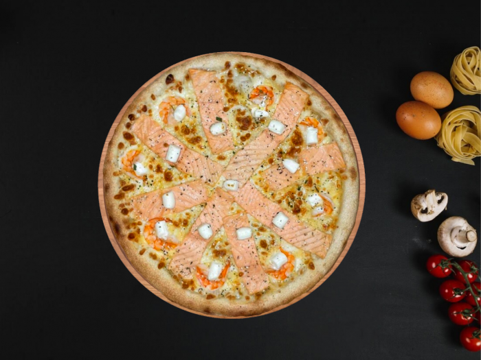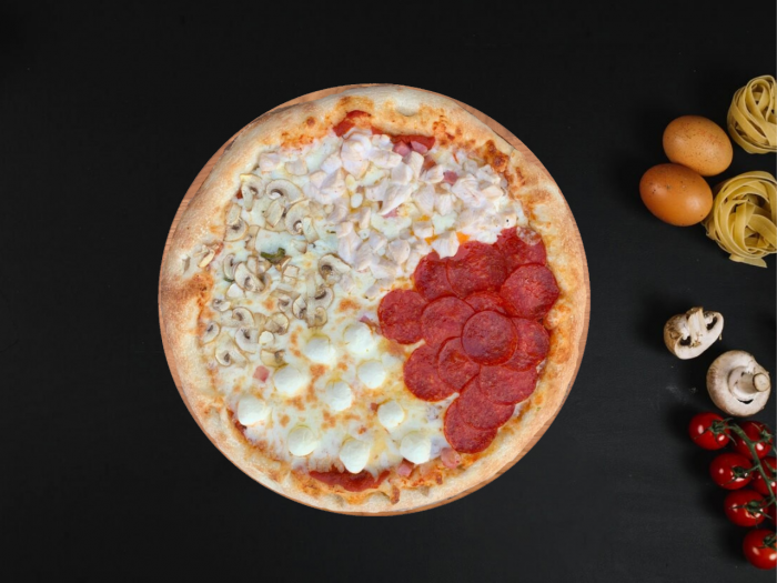 1/2 - ветчина, сыр, красный соус, грибы и прованские травы; 1/2 - лосось, сыр, белый соус, помидор укроп, соус терияки; ; НА ДАННУЮ ПИЦЦУ СКИДКИ НЕ РАСПРОСТРАНЯЮТСЯ