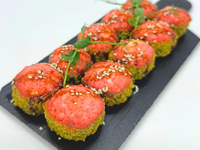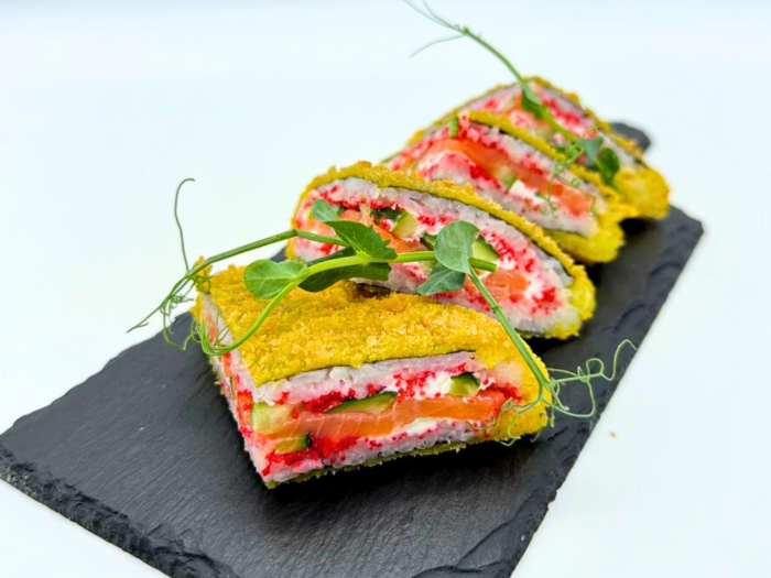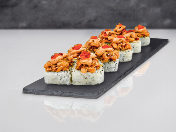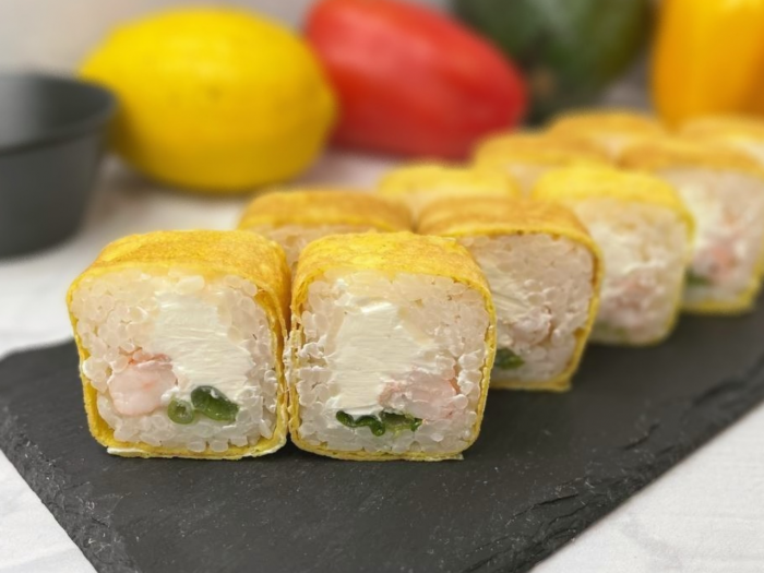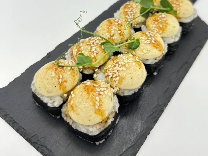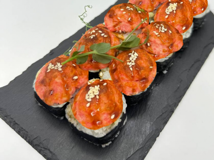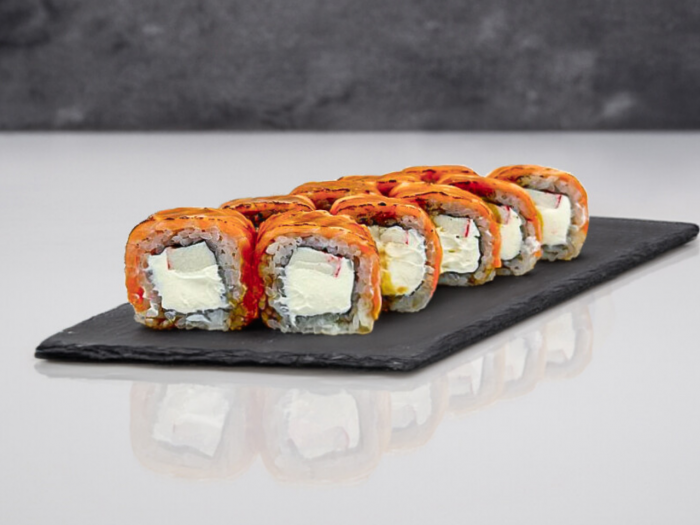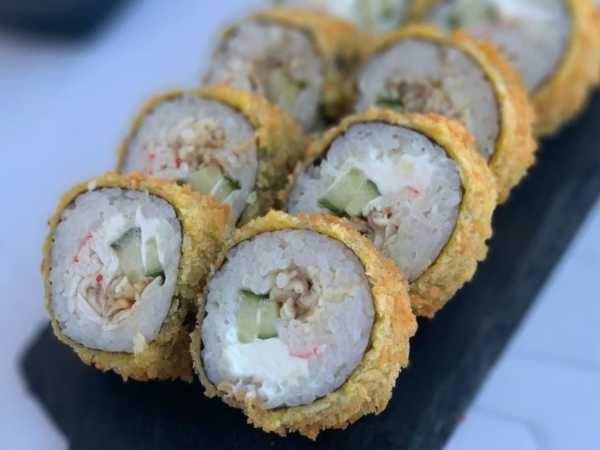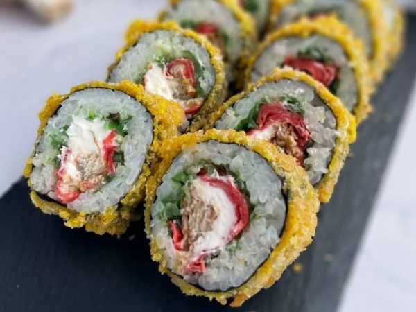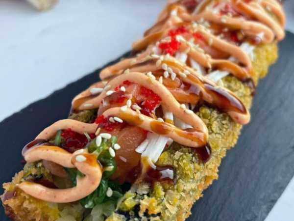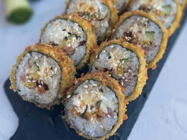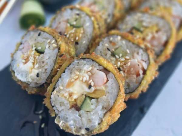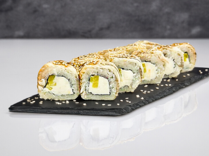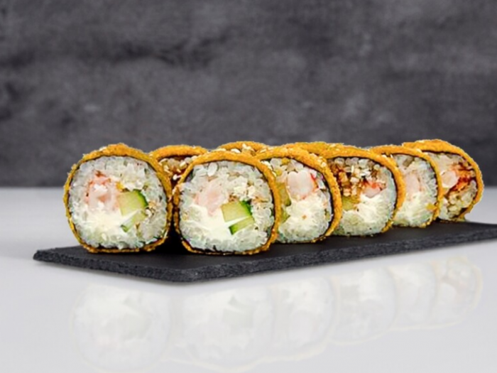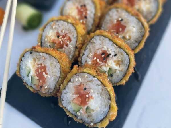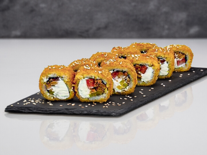 ролл жареный в кляре, икра масаго, сливочный сыр, огурец, терияки соус и кунжут